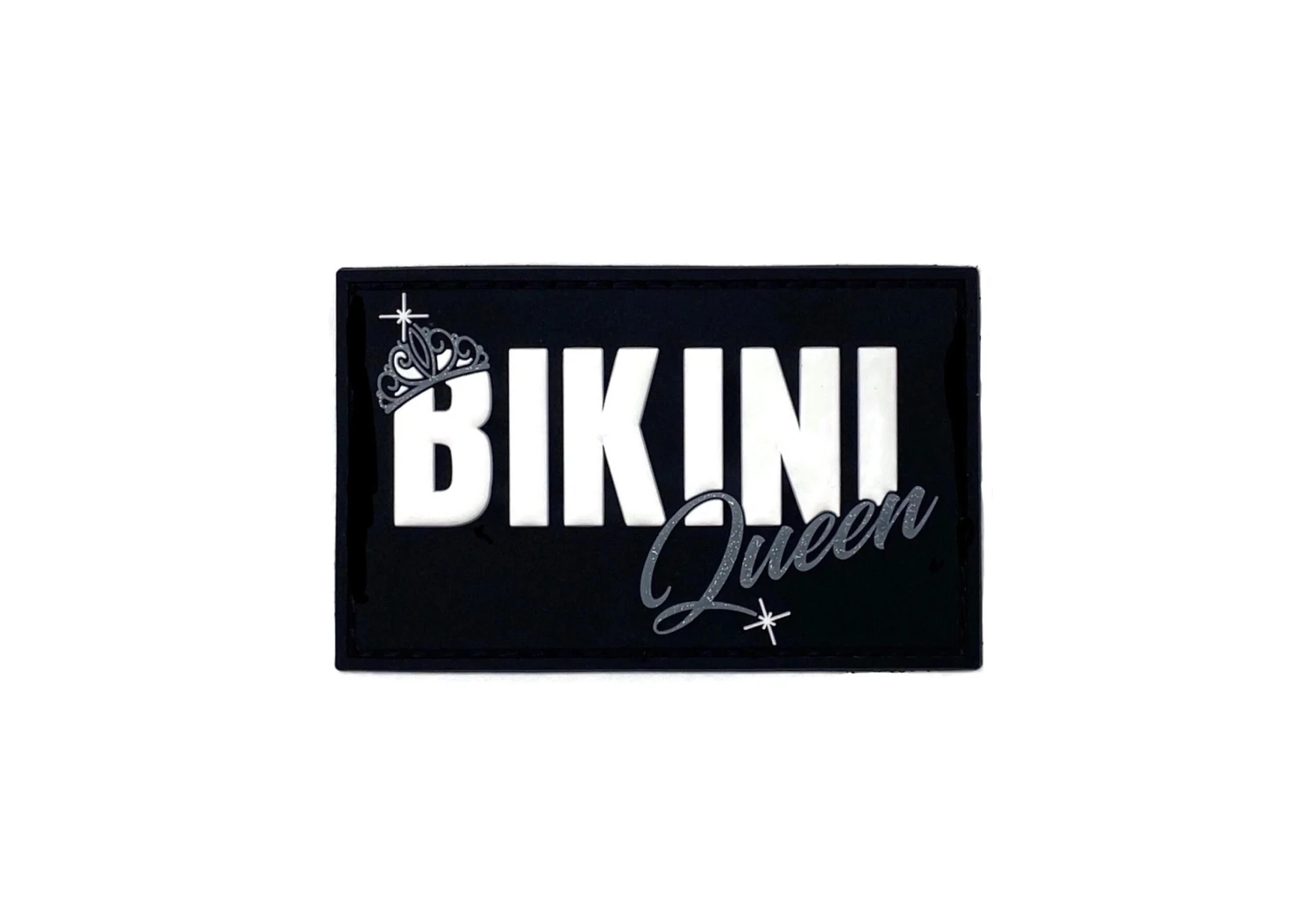Bikini Queen rubber 3D velcro patch in black and white with sparkles included.