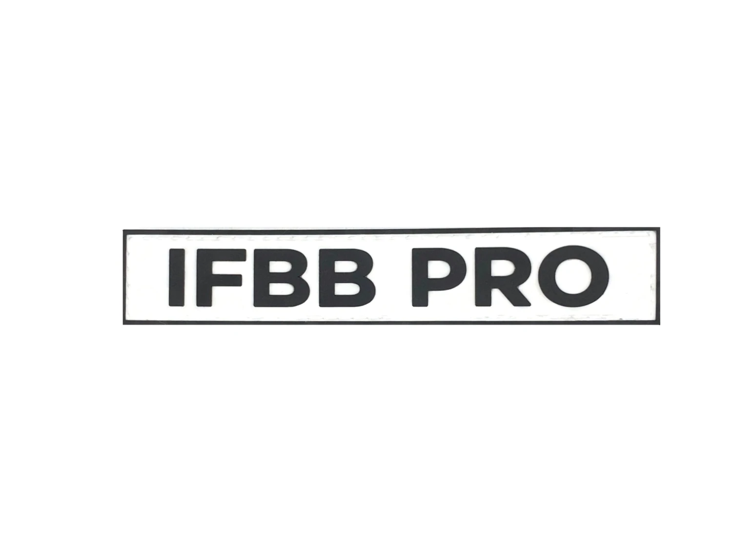 IFBB PRO rubber velcro patch with white background and black writing.
