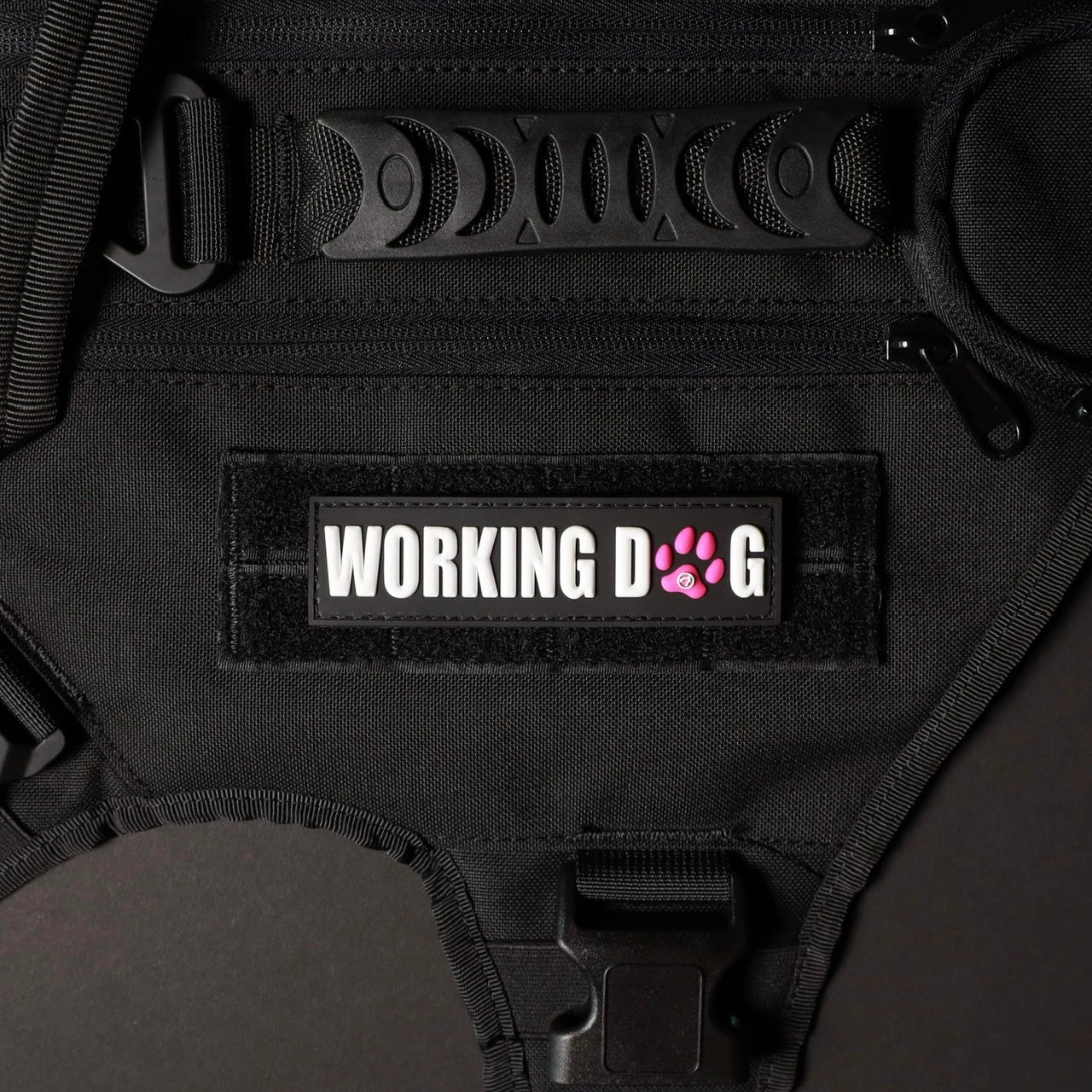 Working dog stitched velcro patch with black background and white writing and pink paw.